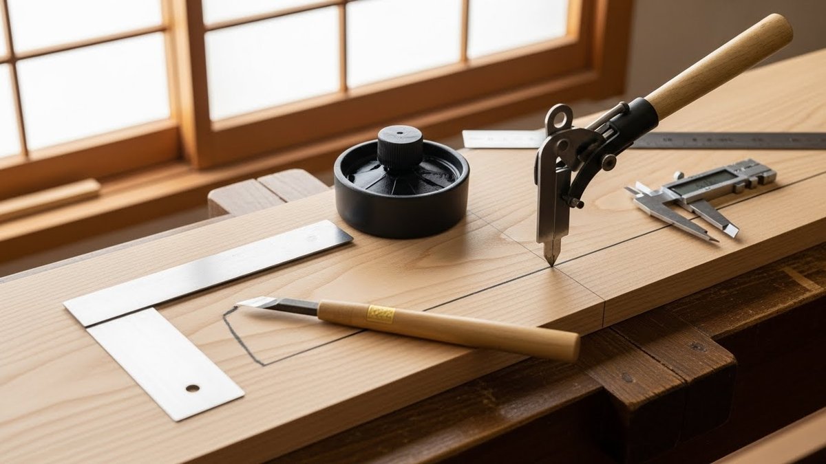 墨付けの精度を左右するのが、罫書具(けがきぐ)です。京指物では、線の太さが変わってしまう鉛筆よりも、刃先で細い線を刻める「白引き」が多用されます。木目に沿って鋭い溝を作ることで、その後の鑿(のみ)や鋸(のこ)の刃がガイドされ、寸法通りの加工が可能になります。